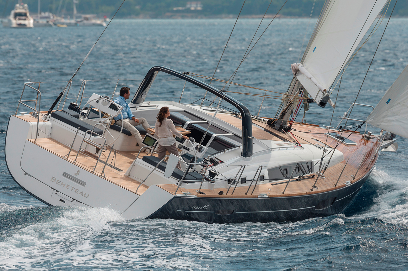The Oceanis 60 features a modern hull with a plumb bow, pronounced aft chine, and wide beam.