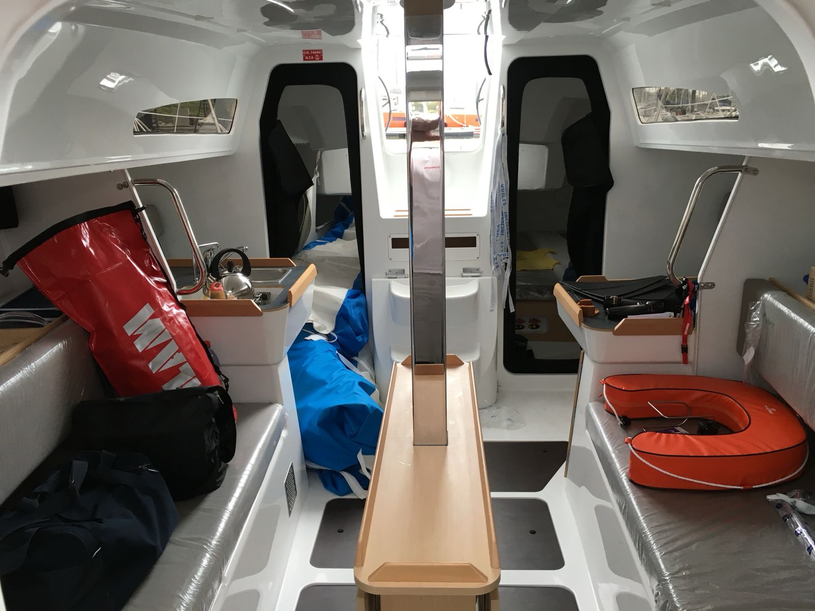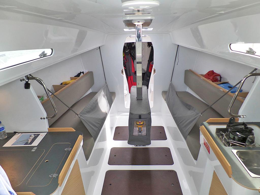 With a streamlined, efficient design, the interior layout accommodates six people, distributed between the two aft cabins and two bench seats in the saloon. A galley and separate head provide for a pleasant life on board, while the saloon enables you to enjoy a relaxing moment with friends after a lively sail. The ergonomic design of the cockpit is optimised for easy, efficient handling.