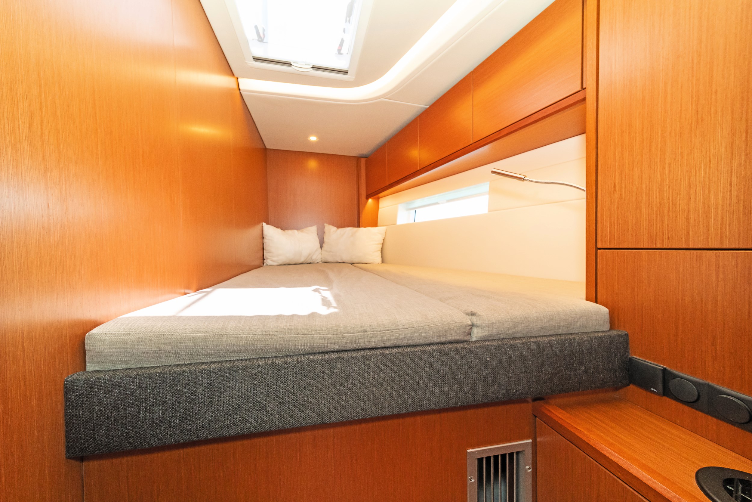 Below deck, the five-cabin layout accommodates guests in four double cabins and one bunk-bed cabin, served by three heads. A separate crew cabin, fitted with two bunks and its own head, provides valuable operational flexibility. The interior is bright, modern and well-appointed, with a welcoming saloon, practical galley and ample refrigeration for extended stays on board.