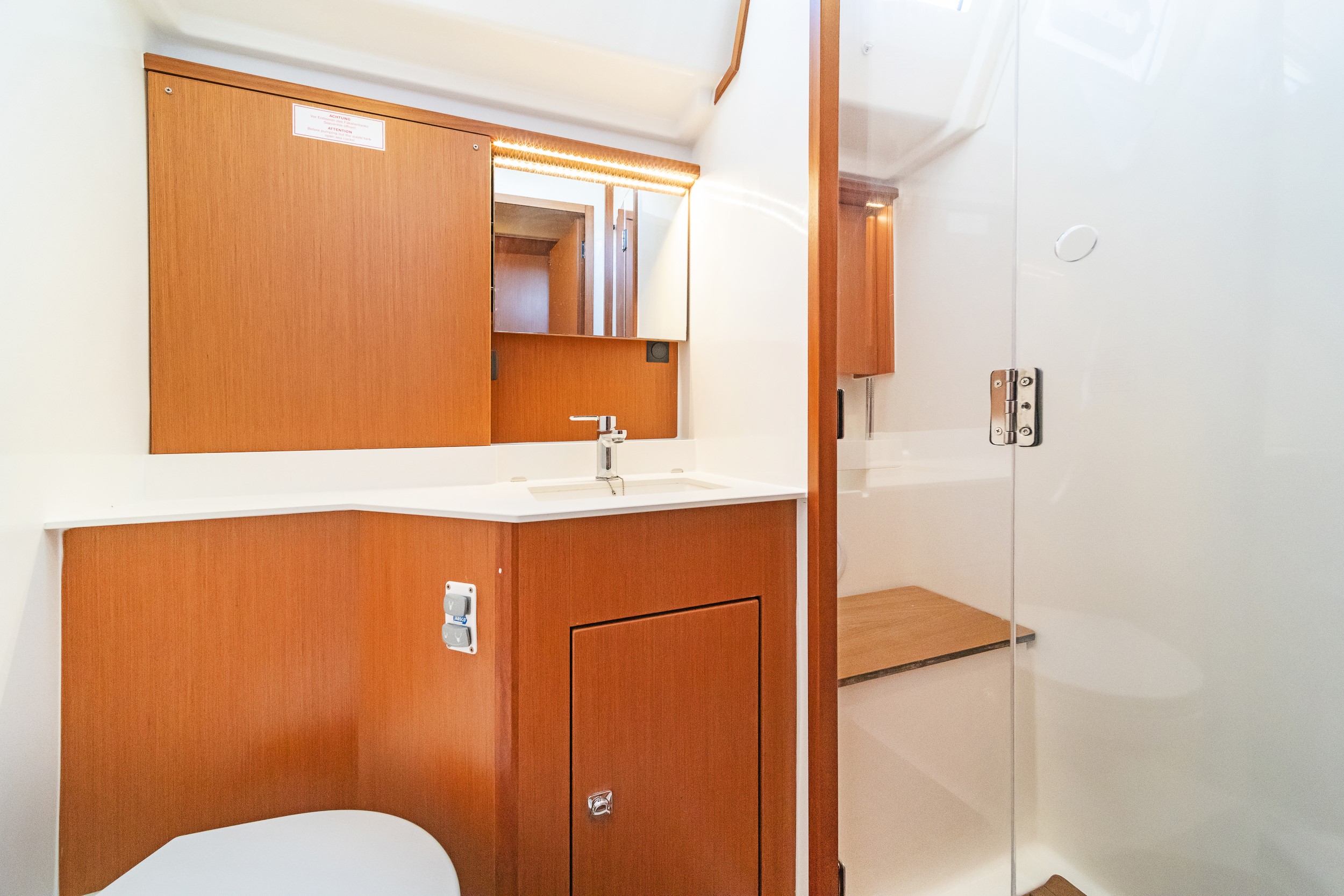 On deck, teak surfaces, twin steering wheels, generous cockpit seating and a large cockpit table create an inviting social space, complemented by a hydraulic gangway, deck shower and easy water access via the swimming ladder.