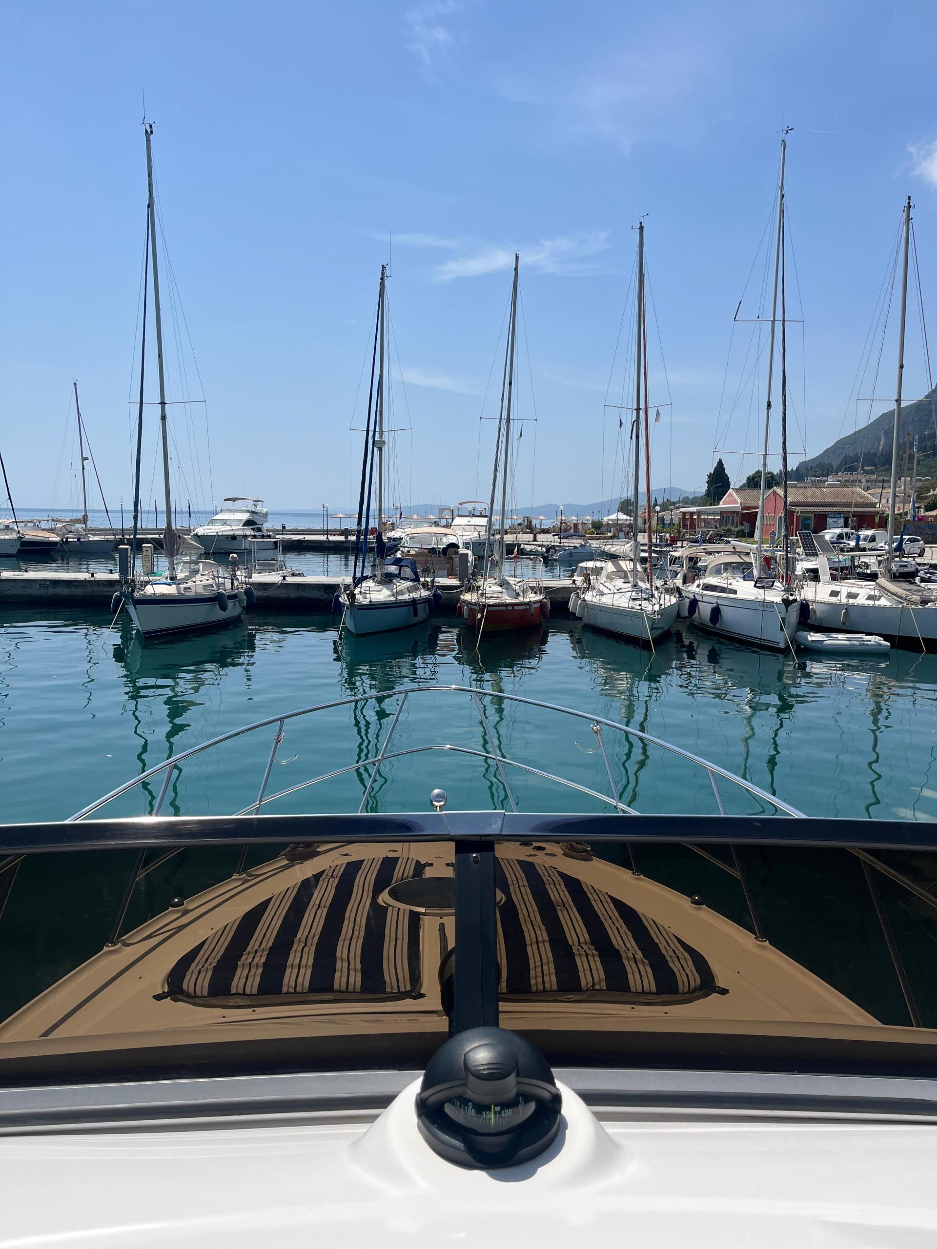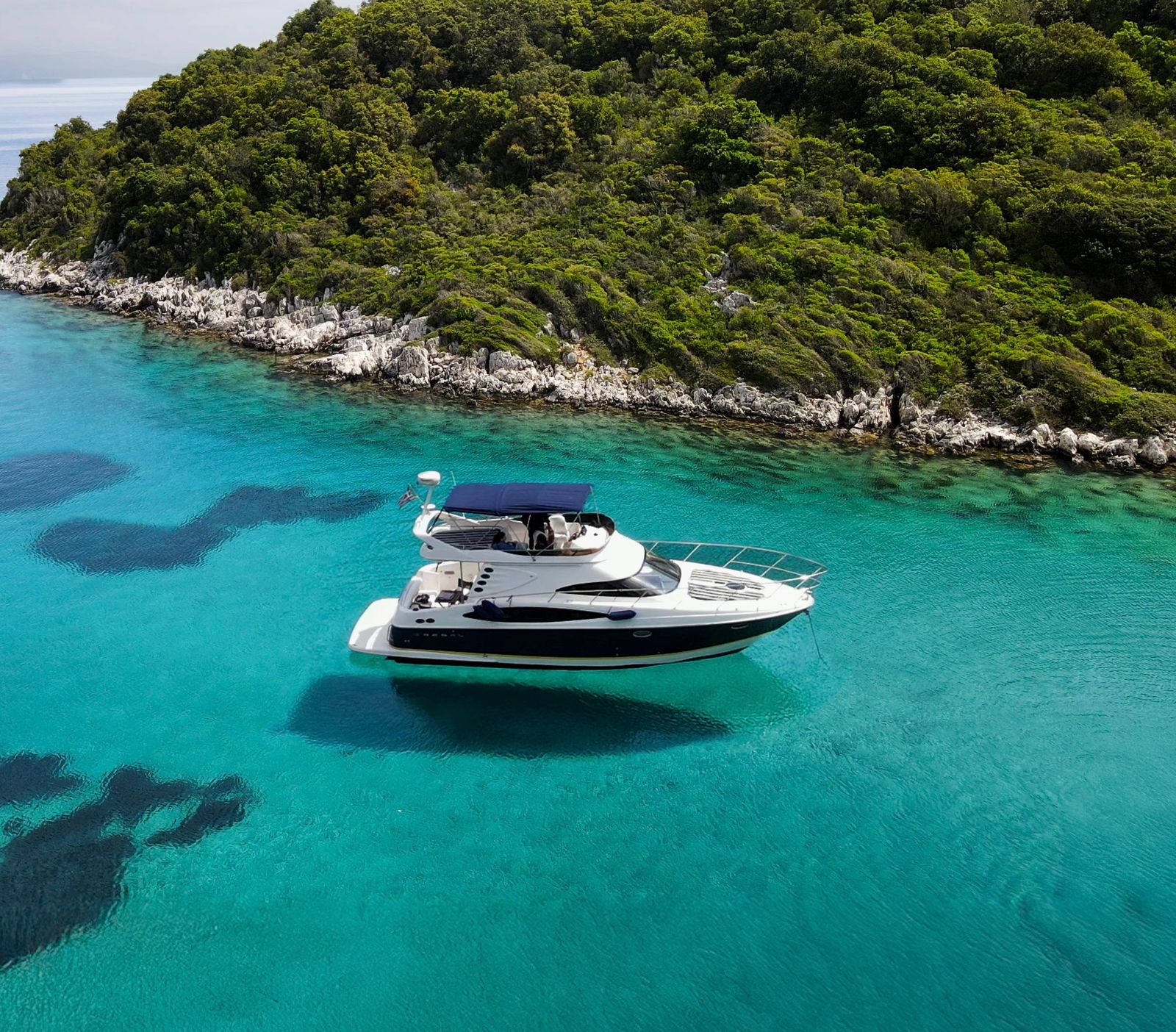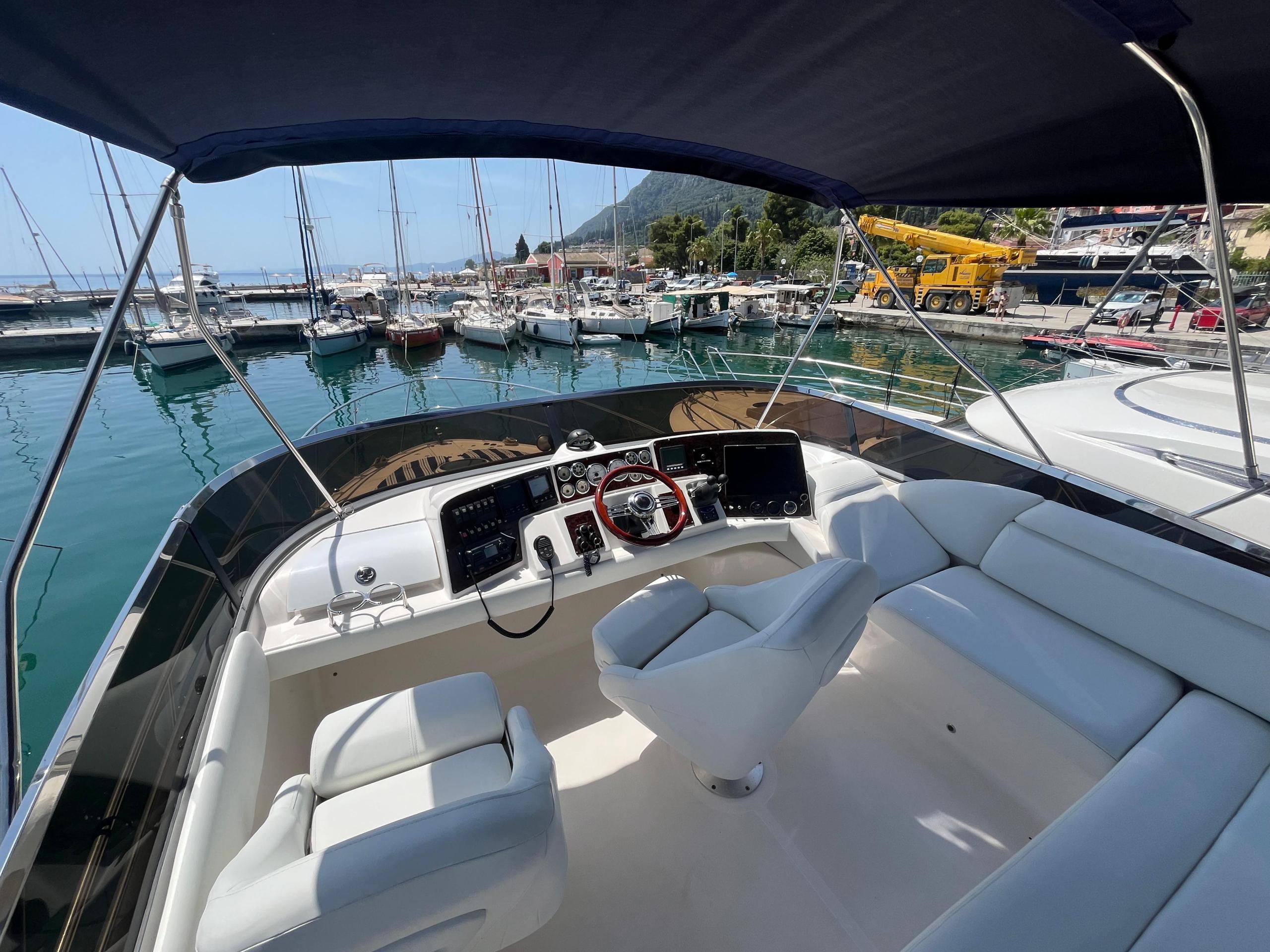 The extended swim platform enhances boarding and water access, ideal for charter operations and family cruising. A molded staircase leads to the flybridge, where the helm, guest seating and commanding visibility create a comfortable and functional upper operating station. Wide side decks and stainless rails maximise safety for guests on board.