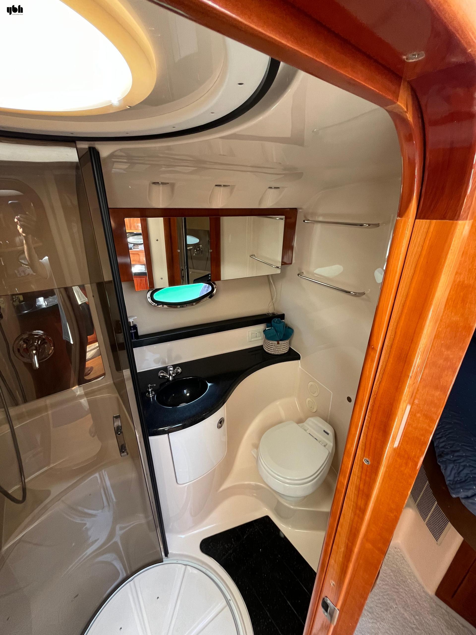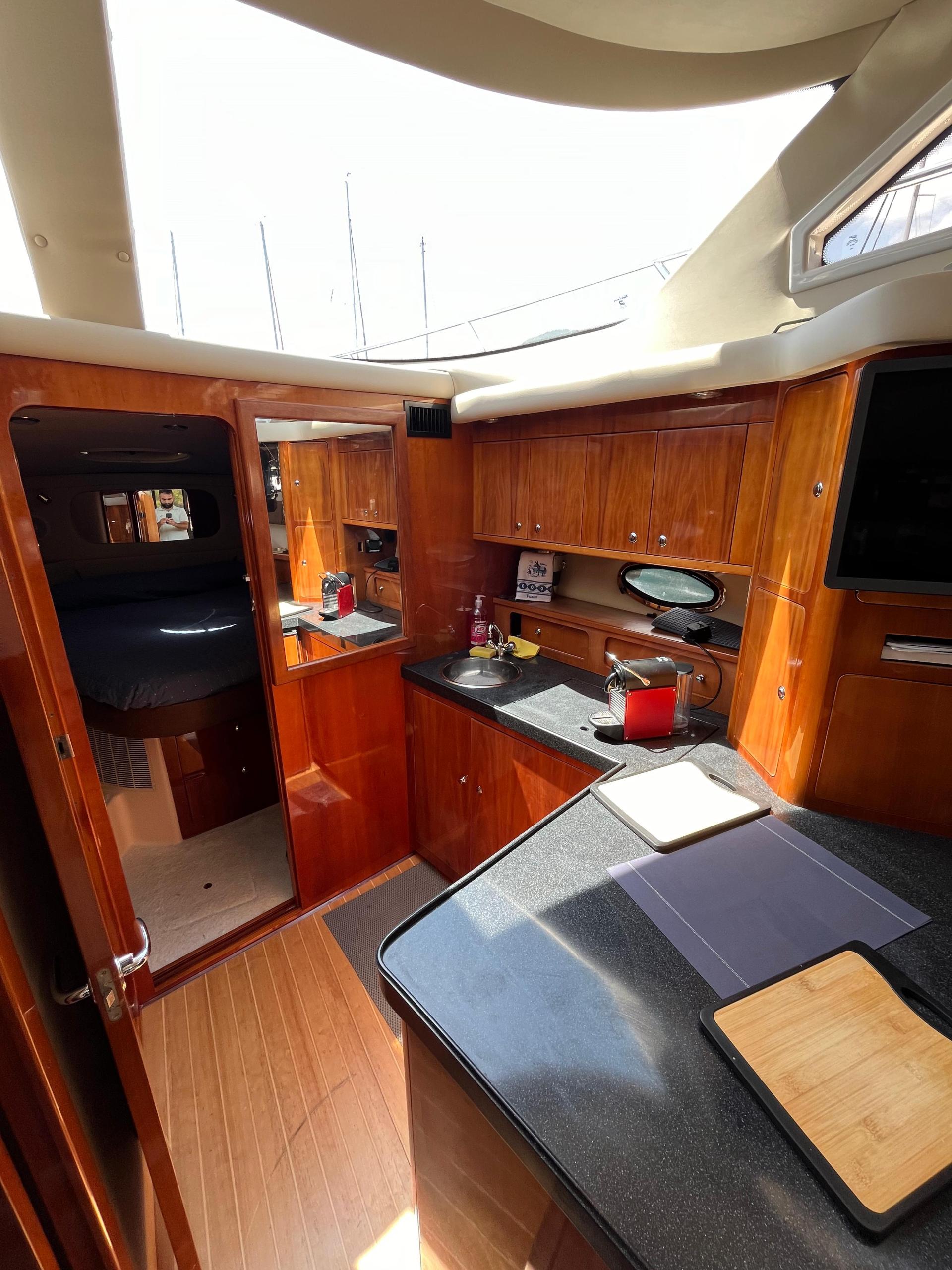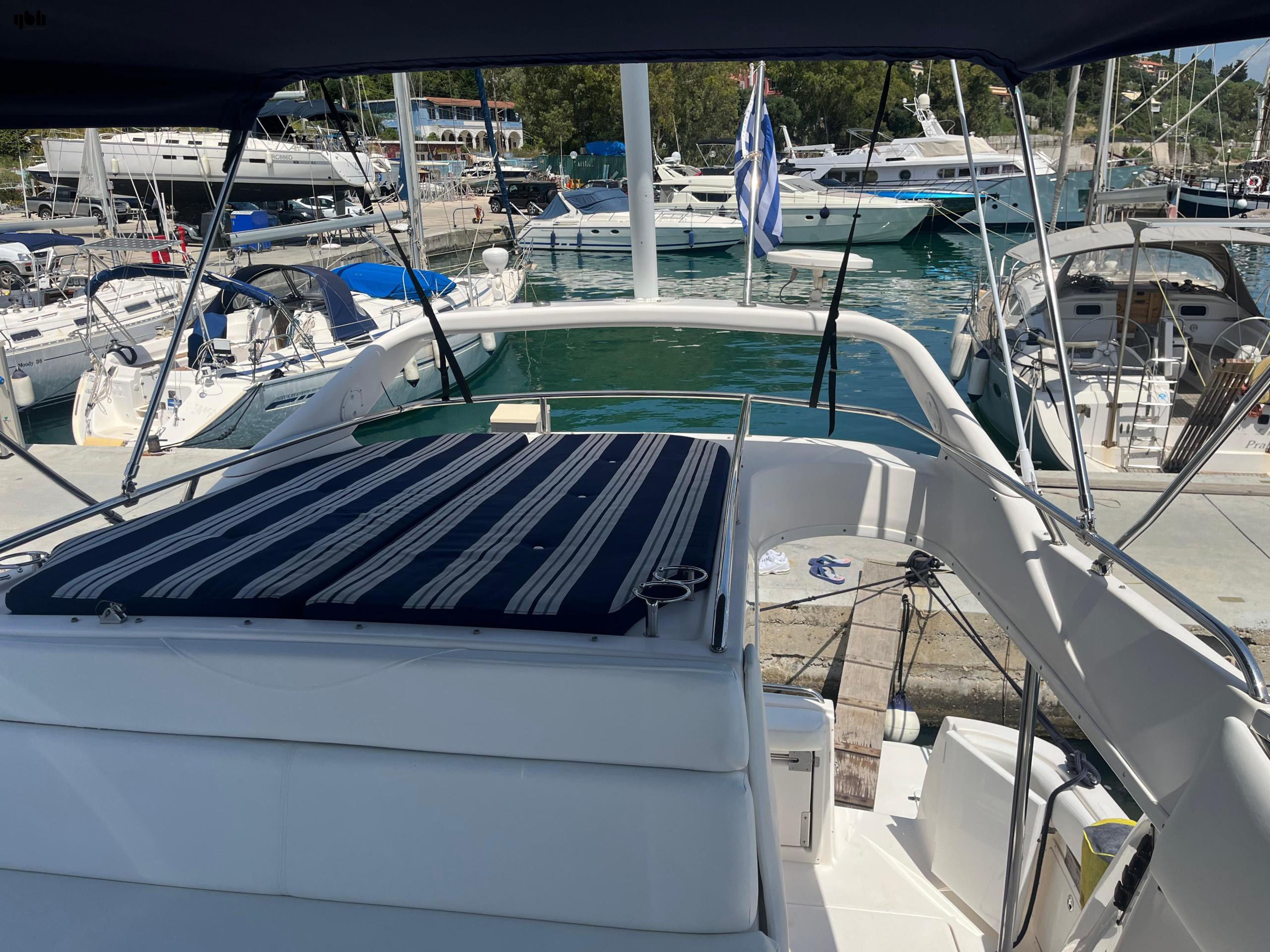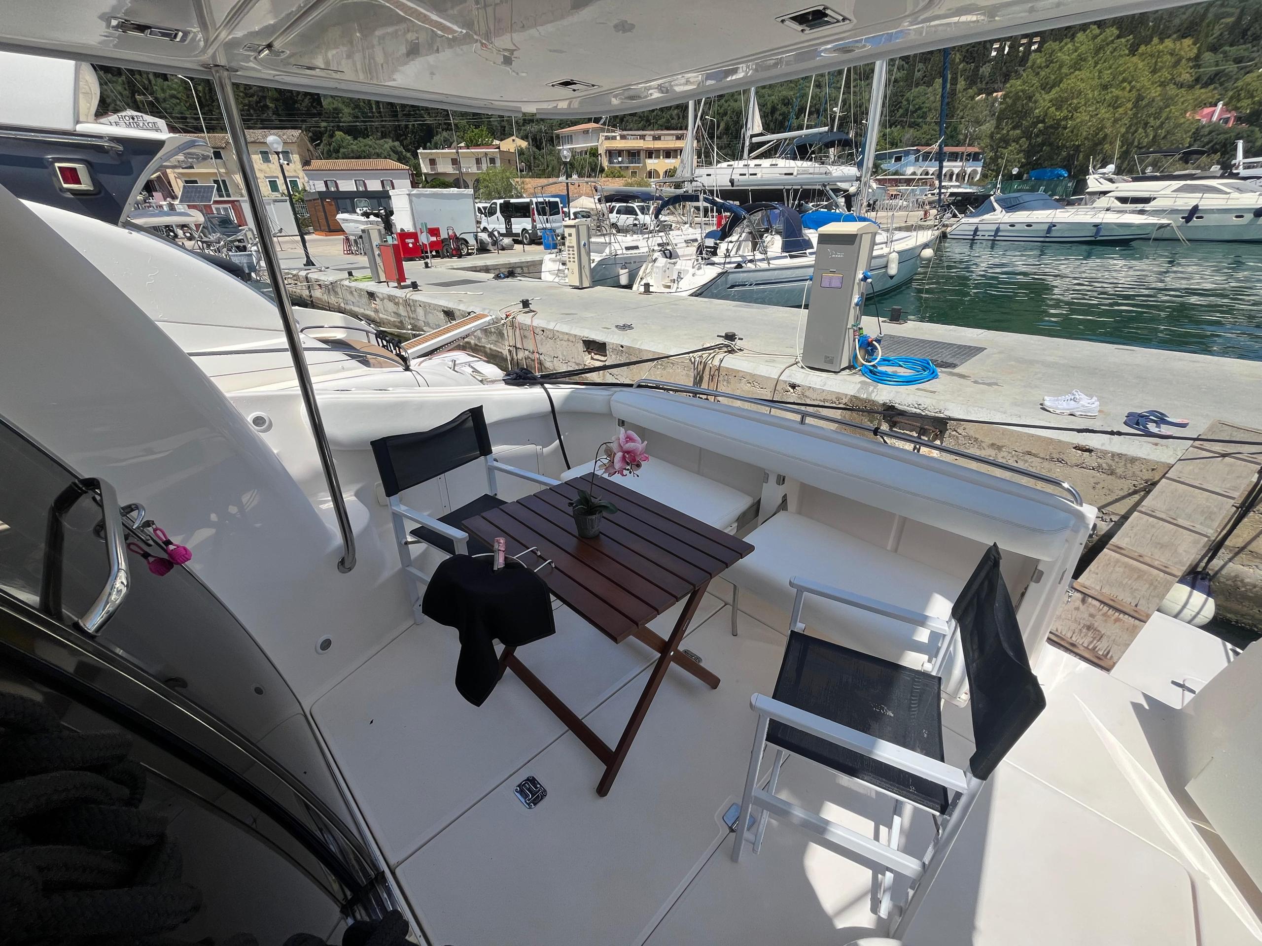 She offers a versatile interior with a bright, full-beam salon and panoramic views. The lower galley is fully equipped, while the two cabins (forward master + guest cabin) provide comfortable sleeping arrangements for extended cruising. The salon converts to an additional double berth, bringing total capacity to six guests. The head compartment includes a dedicated shower area.